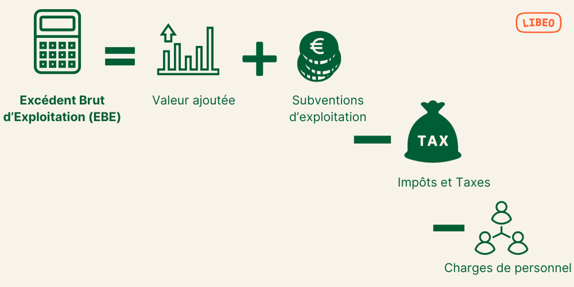 EBE = Valeur ajoutée + Subventions d’exploitation (compte 74) — Impôts, taxes et versements assimilés (compte 63) — Charges de personnel (compte 64).